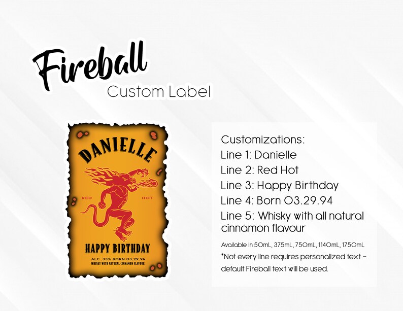 Fireball Cinnamon Whisky | Tastes Like Heaven, Burns Like Hell Fireball Quick Pour Chiller $249.99 Fireball Dragonman 36" Inflatable $59.99 Fireball Soccer Jersey $49.99 Fireball LED Sign $134.99 6' Inflatable Fireball Bottle $119.99 Shop All Drink Get a Drink Dare Get a Dare Personalized Fireball Labels : Engraved Fireball Personalized Bormioli ... These personalized fireball style whisky labels fit a 50ml shot bottle (bottles not . Labels measures medium 50 ml(1.25w x 1.75h) or large 100 ml . You can choose the occasion and the size, and also have them personalized! Create your customized mini bar with these keep calm personalized mini liquor bottle labels?a fun way to get any party going!