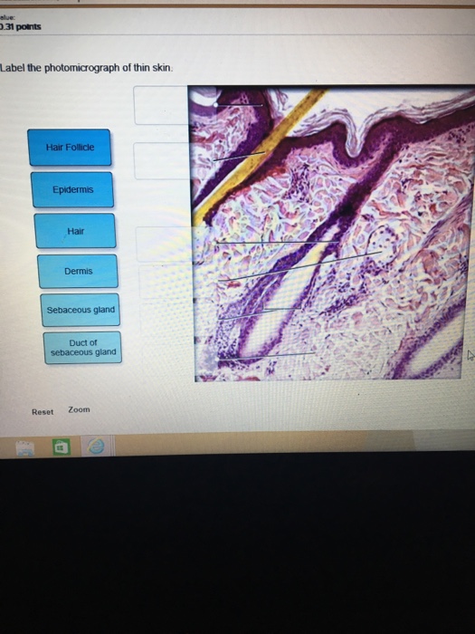 Solved Label the photomicrograph of thin skin. Dermis Duct - Chegg Expert Answer. Who are the experts? Experts are tested by Chegg as specialists in their subject area. We review their content and use your feedback to keep the quality high. 100% (33 ratings) A …. View the full answer. Transcribed image text: Label the photomicrograph of thin skin. Dermis Duct of sebaceous gland Hair Follicle Sebaceous gland ... Question : Question 31 points Label the photomicrograph of thin skin ... Question : Question 31 points Label the photomicrograph of thin skin. Hair Follicle : 391984. Question. 31 points Label the photomicrograph of thin skin. Hair Follicle Hair Dermis Sebaceous gland Duct of sebaceous gland Reset zoom. Solution. 5 (1 Ratings ) Solved. Biology 2 Years Ago 68 Views. Label The Photomicrograph Of Thick Skin : Molecular And Pathological ... Take several photomicrographs of thin skin at this magnification. 1 answer to label the photomicrograph of thin skin. Learn vocabulary, terms, and more with flashcards, games, and other study tools. Stratum corneum stratum basale stratum granulosum stratum lucidum epidermis dermis stratum . Get started with our rundown on some of the best ... Photomicrograph of Thick Skin Quiz - PurposeGames.com This is an online quiz called Photomicrograph of Thick Skin. There is a printable worksheet available for download here so you can take the quiz with pen and paper. Your Skills & Rank. Total Points. 0. Get started! Today's Rank--0. Today 's Points. One of us! Game Points. 6.