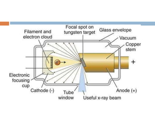 X-ray tube | Radiology Reference Article | Radiopaedia.org An x-ray tube functions as a specific energy converter, receiving electrical energy and converting it into two other forms of energy: x-radiation (1%) and heat (99%). Heat is considered the undesirable product of this conversion process; therefore x-radiation is created by taking the energy from the electrons and converting it into photons.