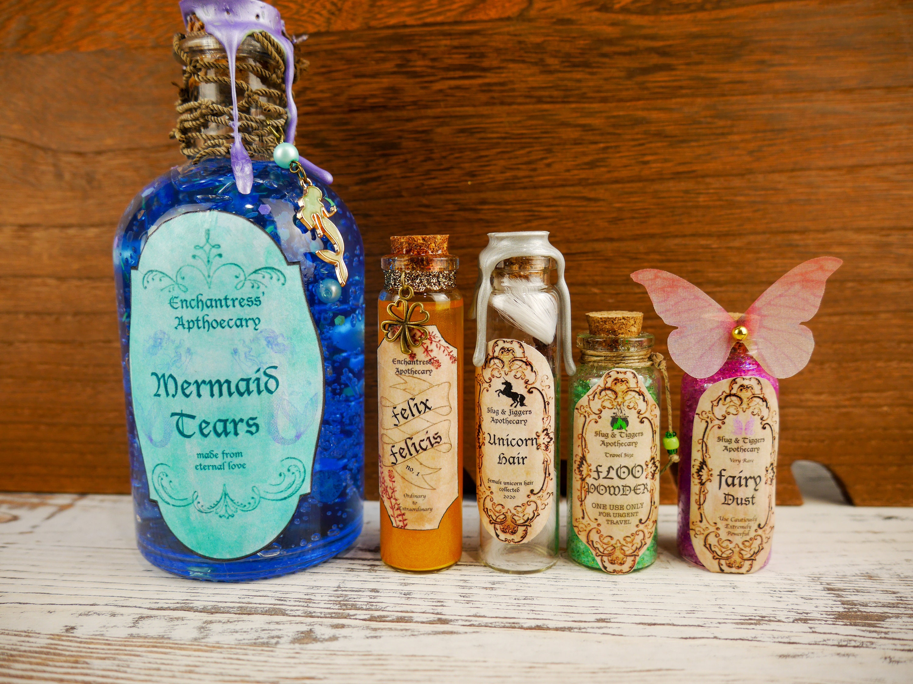DIY Harry Potter Potion Ornaments - Pineapple Paper Co. Fill 1/4 of each bottle with clear liquid glue. Fill the rest with warm water, leaving room at the top to add glitter. Stir until the water and glue are completely combined. Alternatively, you can make the glue and water mixture in a larger container and pour into the bottle with a funnel. Add glitter and swirl to mix. Floo Powder Label | Etsy Just print these out, cut them out and glue them on to whatever cool bottle you want. Fill it up with something magical and BAM, instant crowd pleaser. The example in the photos was printed on an inkjet printer and aged with coffee. It's glued onto a glass bottle which we topped with a cork and some jute twine to complete the look.