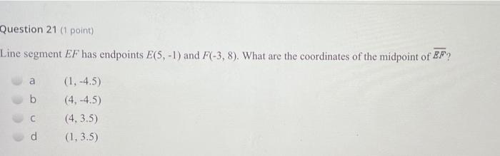 How to find the endpoints of a line segment - Algebra 1 - Varsity Tutors Possible Answers: Correct answer: Explanation: A line's midpoint is the coordinate pair of that line which has the same number of points on either side of it. It bisects the line in two equal parts . Solution: We are given that the line has an endpoint at and its midpoint is on the origin. This known point would be in the Quadrant III and since ...