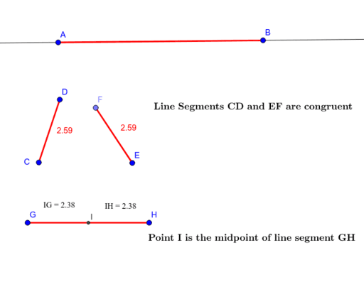 (Get Answer) - Line segment EF has endpoints E(5, -1) and F(-3, 8 ... Line segment EF has endpoints E(5, -1) and F(-3, 8). What are the coordinates of the midpoint of EP. What is a Line Segment? Formula, Examples | Turito - US Learn Line segment definition: A line segment is a one-dimensional figure which describes a path between two points. Unlike a line, a line segment has a definite starting point and a definite endpoint. Thus, we can measure it. Moreover, as a line segment has a defined length, it can form the sides of any polygon. B. segment EF ≅ segment GF because both segments are the … 05.08.2019 · Answer:segment EF ≅ segment GF because both segments are the same distance from the center of circle A ⇒ answer BStep-by-step explanation:* Lets revise some fac… sofiafernandez21 sofiafernandez21 08/05/2019 Mathematics Middle School answered • expert verified If A is the center of the circle, then which statement explains how segment EF is … Points and Line Segment - CCSS Math Answers Where C is 0 and X is 5. Show whether 3 lies in this line segment, length of the line segment and define the type of line segment. Solution: Given, CX is the given line segment where C is 0 and X is 5. 3 lies between 0 and 5. So, 3 is a point in the line segment CX such that the point is 3 places from C and 2 places from X. The Lenght of CX is 5.