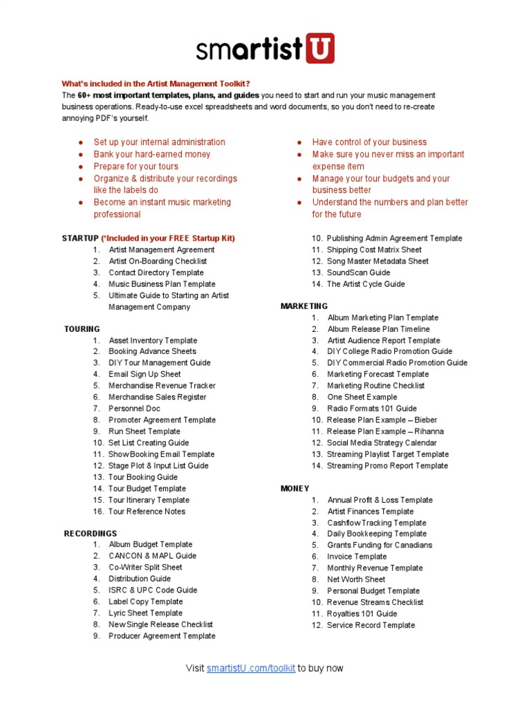 The Artist Management Toolkit - SmartistU All record labels keep a 'label copy' document of each recording - use this template to keep track of your recordings like the labels do. Publishing Admin Agreement. An example of an agreement between an artist and a publisher - where the publisher is the administrator. ... Album Marketing Plan Template.