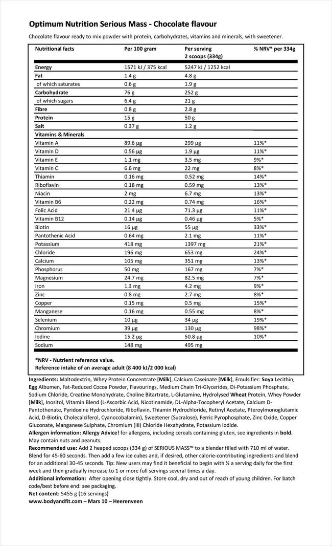 Serious Mass - Optimum Nutrition Ingredients, allergens, additives, nutrition facts, labels, origin of ingredients and information on product Serious Mass - Optimum Nutrition