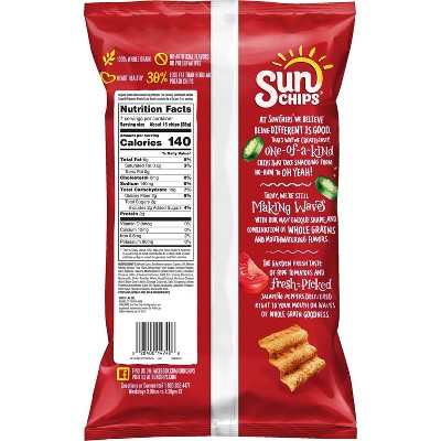 SunChips Garden Salsa Flavored Wholegrain Snacks - 7oz Indulge in a flavorful snack, like Sun Chips Garden Salsa Flavored Whole Grain Snacks. These whole grain chips have a delicious garden salsa flavor that has a light spicy kick, and they have 30% less fat than regular potato chips. Garden Salsa Sun Chips have no artificial flavors, so you really can enjoy the flavors of a salsa made from garden-fresh produce in each crunchy …