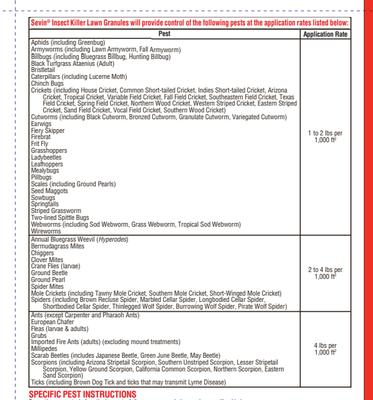 Sevin 10 lbs. Lawn Insect Killer Granules 100530128 - The Home Depot Sevin Insect Killer Granules is designed to kill over 100 listed insects on home fruit and vegetable gardens, ornamentals, flowers, shrubs, lawns and home perimeter. It kills lawn and garden invading insects including damaging Japanese beetles, ants, grubs, fleas, ticks, spiders, chiggers, chinch bugs and many more listed on the label.