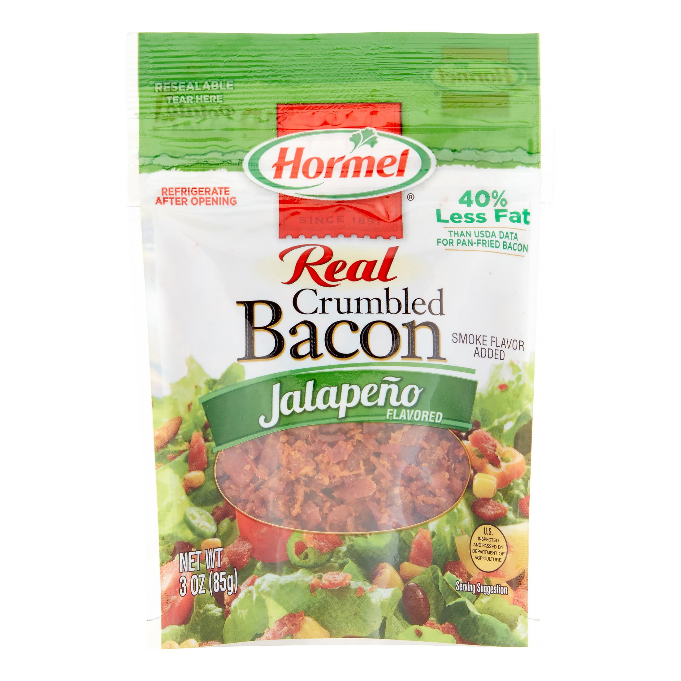 HORMEL Crumbled Bacon, Jalapeno, 3 Ounce (Pack of 8) HORMEL Real Crumbled Bacon Jalapeño Flavored adds a southwest spark to all your bacon-inspired dishes. Game enough? Our bacon bits contain 40 percent less fat than USDA data for pan-fried bacon. That's less fat without ditching flavor. It's thick cut, brine-seasoned, and strikingly handsome on all your favorite fixings.