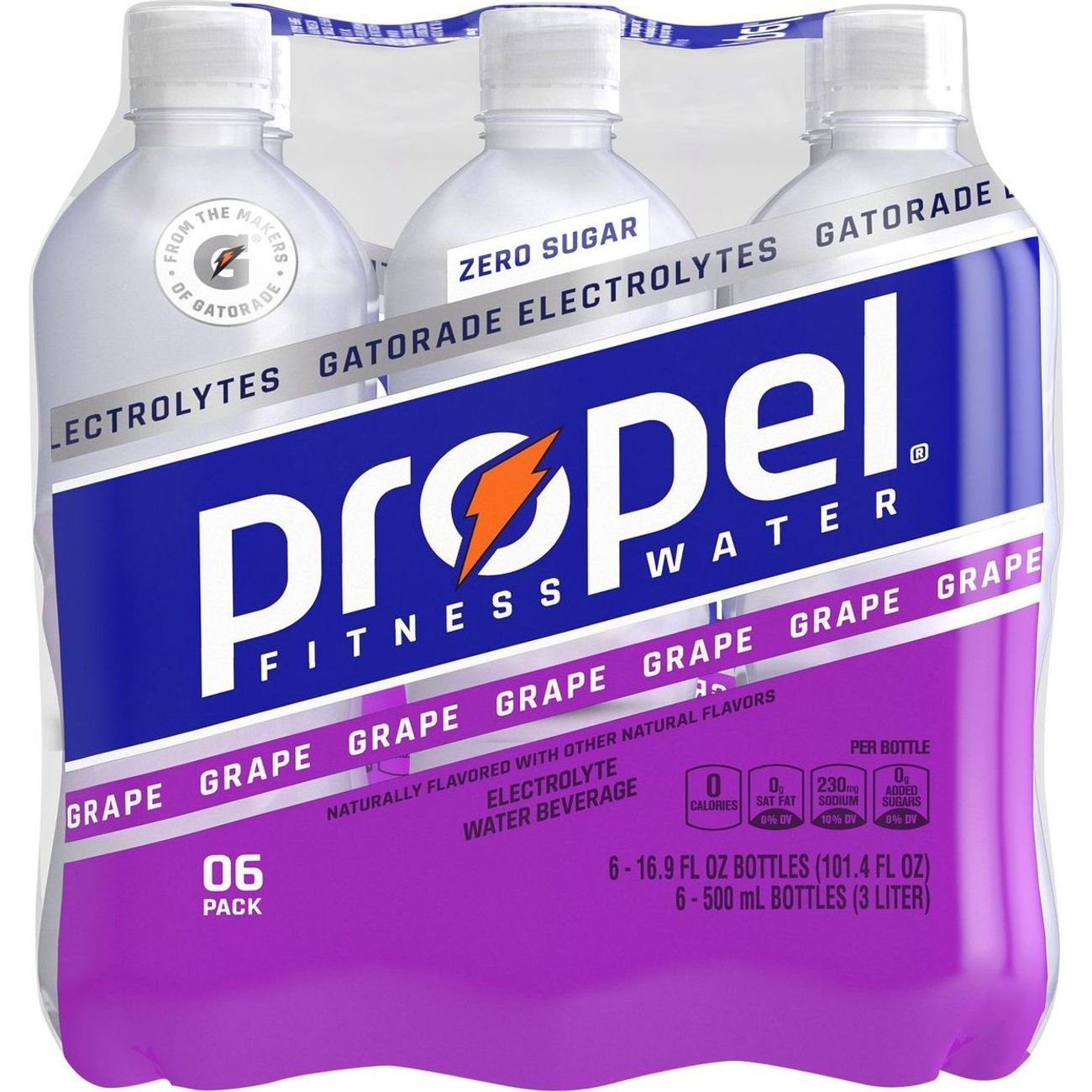 Propel Zero Calories Berry Enhanced Water Beverage - 12 pk Per Bottle: 0 calories; 0 g sat fat (0%DV); 230 mg sodium (10%DV); 0 g sugars. Sugar free. From the makers of G. Electrolytes. Naturally flavored with other ... Propel Zero Sugar Electrolyte Water Beverage Mix Berry - 10 ct 0 calories per packet. 0 g total sugar. Zero sugar. Good source of vitamin C. From the makers of G. Electrolyte. 10 packets. When you sweat you lose more than ...